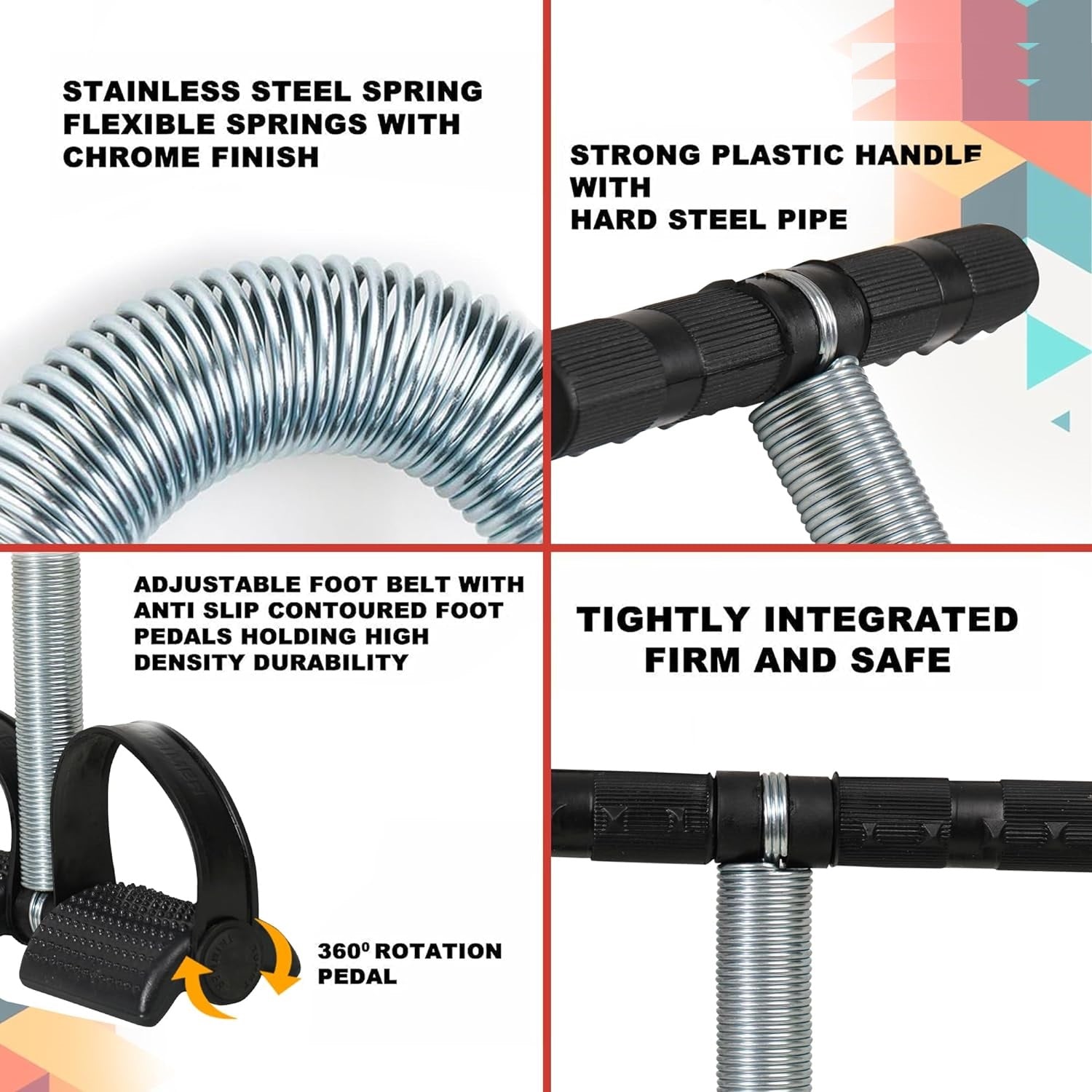3. The Steel Coil Spring Bar Creates Resistance On Every Pull Making You Work and Perspire More. With Contoured Foot Pedals for Better Grip on Sole and Easy Grip Handles.The Steel Coil Spring Bar Creates Resistance On Every Pull Making You Work and Perspire More. With Contoured Foot Pedals for Better Grip on Sole and Easy Grip Handles.